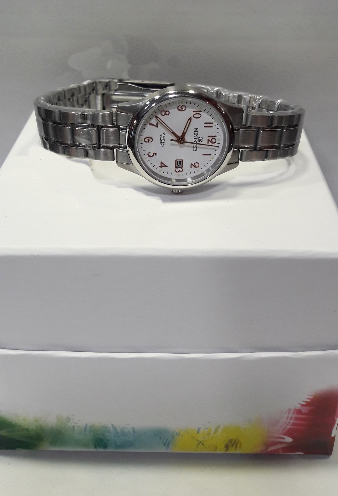 Reloj de señora en acero, con números color cobre y esfera blanca.